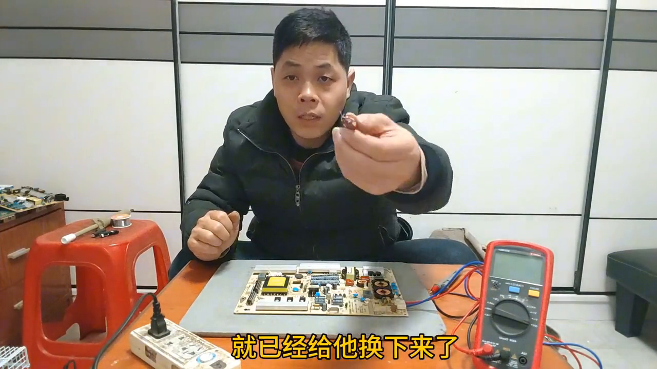 现在我就去料板上找一个电容代换一下,看能不能捡个漏。好,它这个坏的电容就已经给它换下来了,你看这个已经鼓包了这个电容,你看这新的已经给它装上去了,同时我把线也给它电源线给它接起来了。