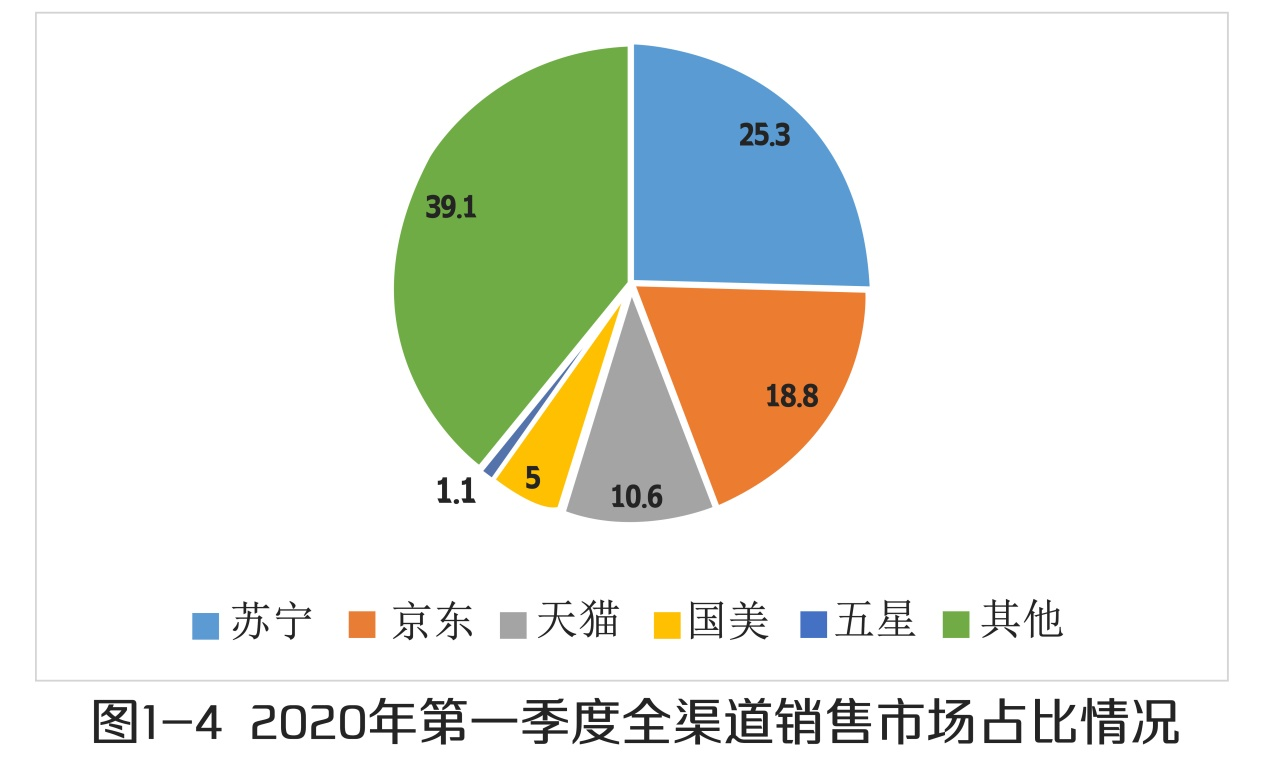 新冠肺炎疫情影响下·我国家电行业消费市场格局持续调整·苏宁丶京东丶天猫市场份额上升·国美丶五星市场份额下降·苏宁全渠道市场份额独占鳌头。根据全国家用电器工业信息中心数据显示,从2020年一季度家电行业全渠道销售市场份额来看,如图1-4所示,苏宁依靠线上线下全场景覆盖模式,市场占比进一步提升,占家电消费市场份额达25.3%,同比提升2.2个百分点,位居众渠道首位;京东占家电消费市场份额达18.8%,位居市场第二位;天猫占家电消费市场份额达10.6%,位居市场第三位;国美占家电消费市场份额达5.0%,同比下降0.9个百分点,位居市场第四位;五星占家电消费市场份额达1.1%,同比下降0.2个百分点,位居市场第五位;其余公司占家电消费市场份额合计为39.1%,同比下降7.9个百分点。