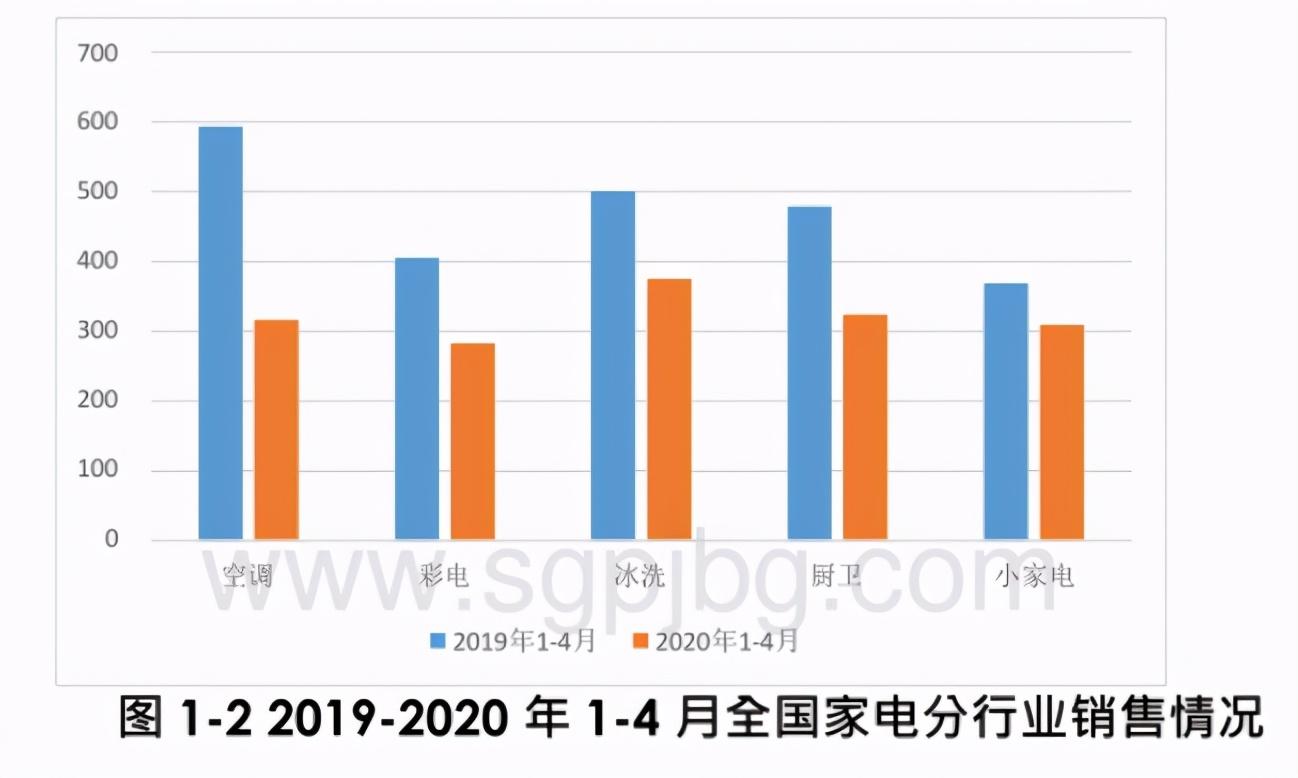 从分行业销售情况来看·2020年1-4月新冠肺炎疫情影响下·全国安裝类大家电销售额出现断崖式下滑,小家电产品降幅不明显。根据全国家用电器工业信息中心、中怡康和奧维云网数据分析,如图1-2所示,从空调产品来看,2020年1-4月全国空调产品销售额降至317亿元,而2019年同期销售额为593亿元,同比下降46.6%;从彩电产品来看,2020年1-4月全国彩电产品销售额达283亿元,而2019年同期销售额达405亿元,同比下降30.3%;从冰洗产品来看,2020年1-4月全国冰洗产品销售额达375亿元,而2019年同期销售额达500亿元,同比下降25%;从厨卫产品来看,2020年1-4月年全国厨卫产品销售额达324亿元,而2019年同期销售额达478亿元,同比下降32.3%;从小家电产品来看,2020年1-4月年全国小家电产品销售额达309亿元,而2019年同期销售额达368亿元,同比下降16.1%。