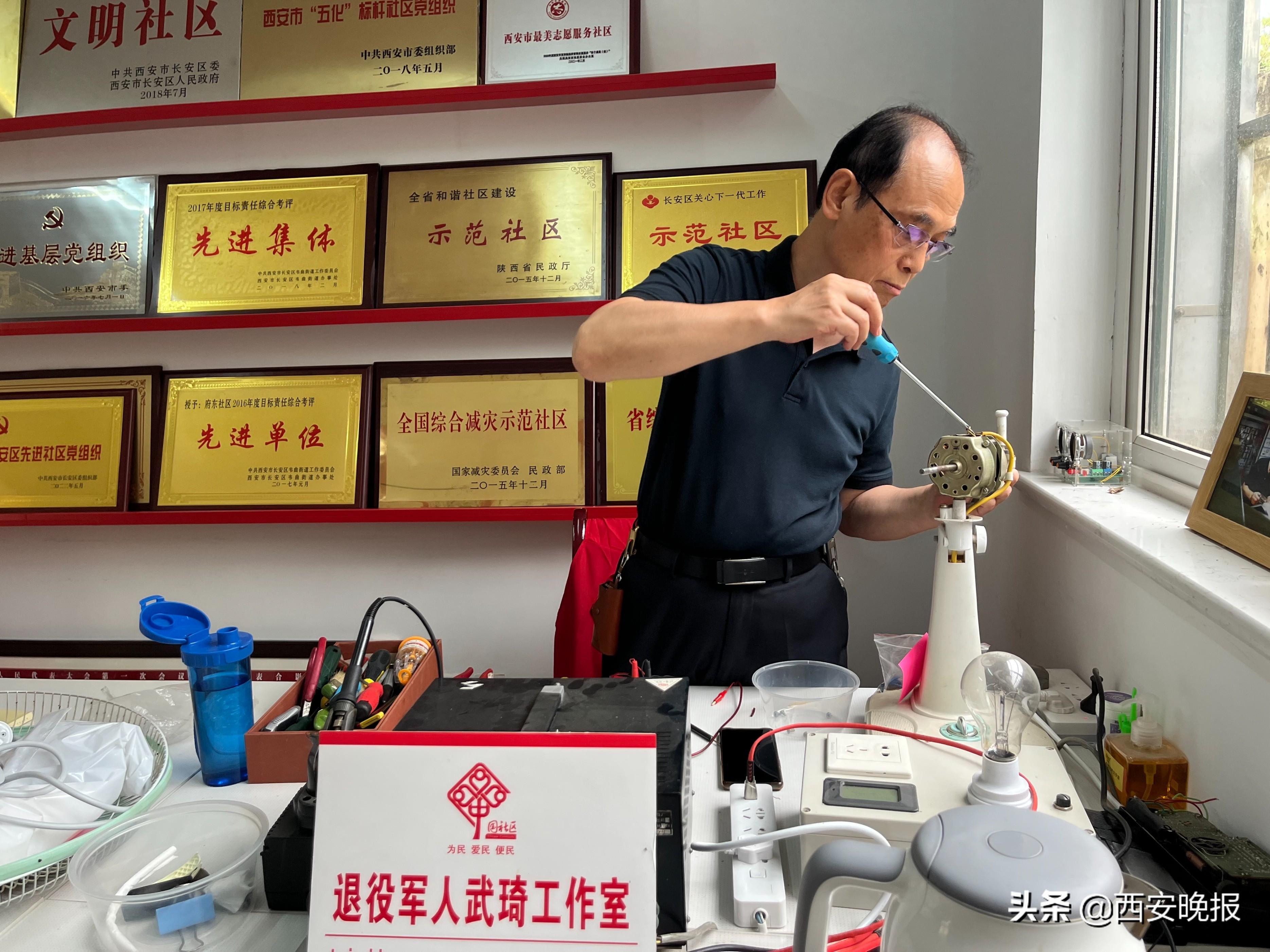“武师傅,我爸妈家的热水壶突然不能用了,您帮我看看还能修不?”“好的你放这儿,修好了我打电话你再来取。”每周四,是武琦到长安区韦曲街道府东社区为广大居民义务修理家电的日子。
