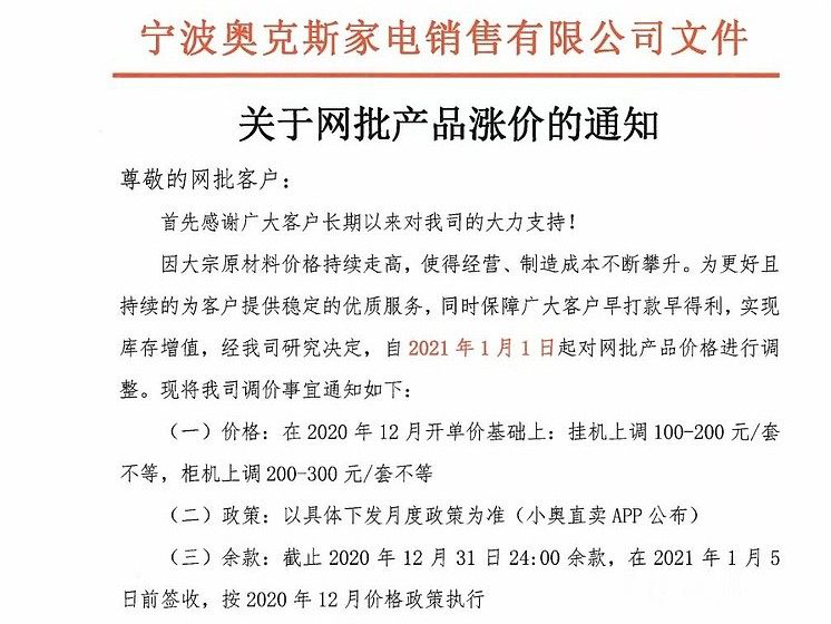 事实上,从去年底到今年初,已经有多个家电品牌发出了涨价“预告”,其中包括奥克斯、志高、海信、TCL等。