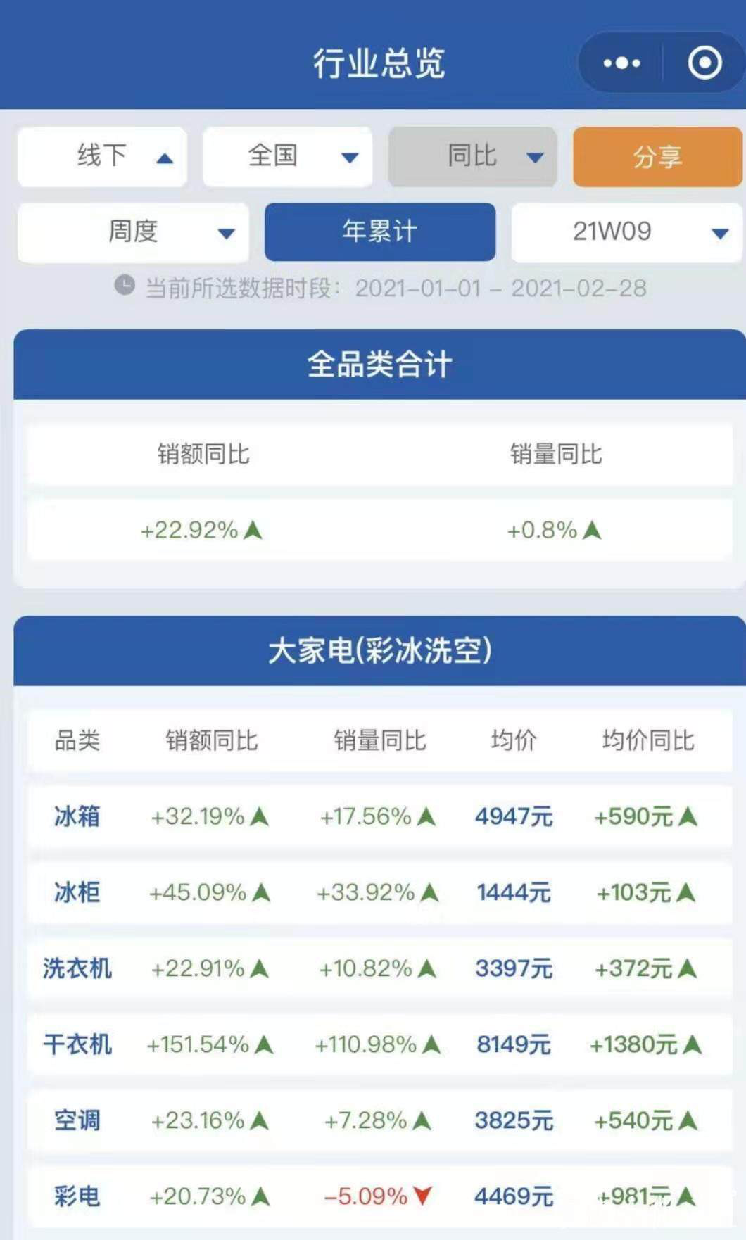 从产品上来看,受制于铜等大宗原材料大涨,空调和冰箱等白电的涨价幅度最大,再次超过两位数,而依赖LED屏的彩电业等黑电也没有“幸免”。从奥维云网的统计数据看,今年1月1日至2月28日,全国大家电均价同比均有上涨,金额从100多元到1000多元不等。