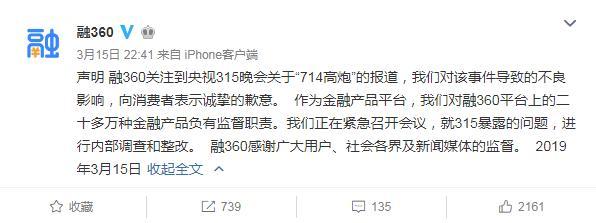 融360回应称:我们对该事件导致的不良影响,向消费者表示诚挚的歉意。作为金融产品平台,我们对融360平台上的二十多万种金融产品负有监督职责。我们正在紧急召开会议,就315暴露的问题,进行内部调查和整改。 融360感谢广大用户、社会各界及新闻媒体的监督。