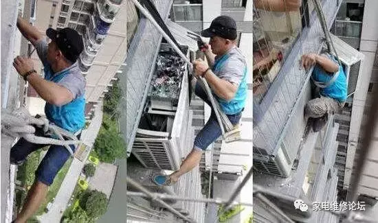 家电维修也有旺季淡季之分,旺季毫无疑问就是夏季了,维修的家电主要是空调、电视、洗衣机、冰箱等。南方地区夏季要是没空调真是无法忍受的,客户即使多么无奈也得修,因此空调是修得最多的,但其中80%都是技术含量比较简单的故障处理,一般来说就是不制冷和漏水,不制冷方面最常见的原因就是外机压缩泵无法正常工作、制冷剂不足等,处理方法有检查电源电线、更换启动电容、更换散热电机、更换压缩泵、检查制冷剂泄漏点、补充制冷剂等等,费用从100~600以上不等。有些人会说,查查线路,换根电线,换个电容,就要收费1~200,太贵了,一根电线才几个钱,电容才几个钱?但事实上,技术含量不高,不代表操作难度不大,他们可能没有想过,维修员大多都是冒着生命危险来进行维修的。空调的室外机,基本上都是安装在高空中,低的在二楼3~5米高,高的2~30层楼可能有几十上百米高,有些房子有放室外机的小平台还好,维修员起码能有个牢靠的落脚点稳稳当当地修,有些完全没有下脚点的,维修员只能直接骑坐在室外机上,就靠室外机的支架来支撑整个重量,危险程度可想而知,如果遇上螺丝锈死,刀砍斧砸就是拆不下来的情况,那种人在半空风雨飘摇的情景真是想死的心都有。小编就经历过,搭档身上只系着一根安全绳,整个人直接坐在生锈的室外机上面,左右来回挪动一点一点把外壳拆开更换零件,看着这个5楼外墙上面生锈的支架,真是担心是否能承受得住;更有甚者,搭档也是身上只系着安全绳,从17层的房间窗户爬出去,踩着窗户艰难地攀到18层的空调小平台上修室外机,17楼的高度,估计也有50多米了吧,一般人往下看也够胆战心惊了,何况是没有下脚点硬是踩着窗户从17层爬到18层,这个难度可想而知,胆子小一点也不可能完成,小编自问没有恐高症,但是像这样的操作小编实在不敢尝试,即便有安全绳,但是不可预知的情况实在太多,万一失足,安全绳最多只能保命,但是在高空下坠碰撞所产生的伤害也是非常严重的。另外维修时为了方便查找出故障点,很多时候都是带电操作,这个也非常危险,室外机日晒雨淋外壳和线路都很容易老化,漏电并非不可能,维修员操作不当的话很容易就会触电,因此空调维修员实际上是一个高危工种,很多时候修一台空调,没有1~2个小时都拿不下来,1~2百的维修费用,其实不一定就能够反映出这个维修过程的价值的。当然,如果遇到新的大型商厦有设置空调外机专用平台的,那确实是比较好做,但是也不能说舒服,毕竟10台8台外机同时工作的空间,那个噪声和热量一点也不好受。