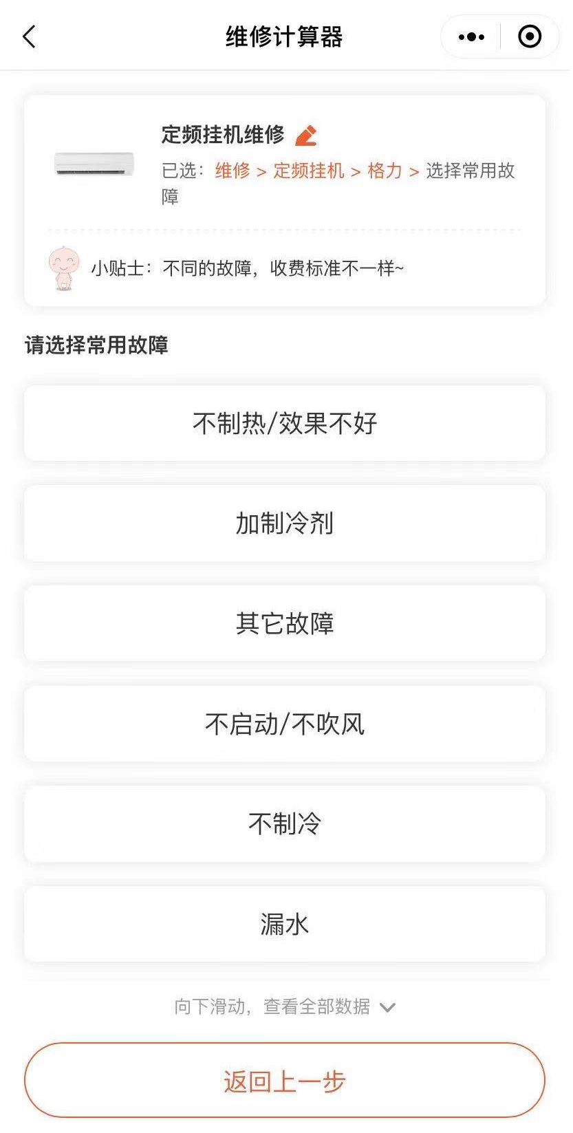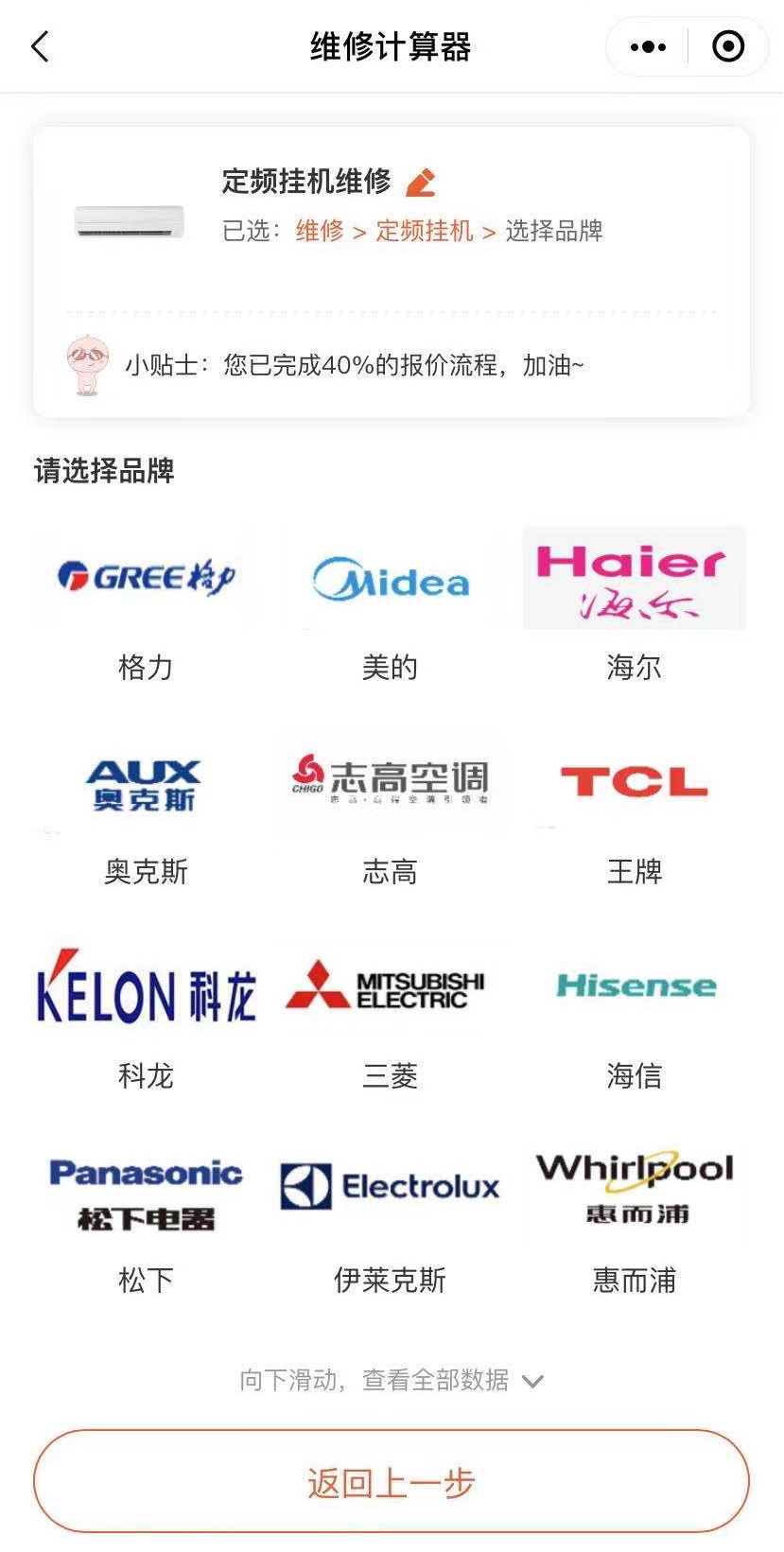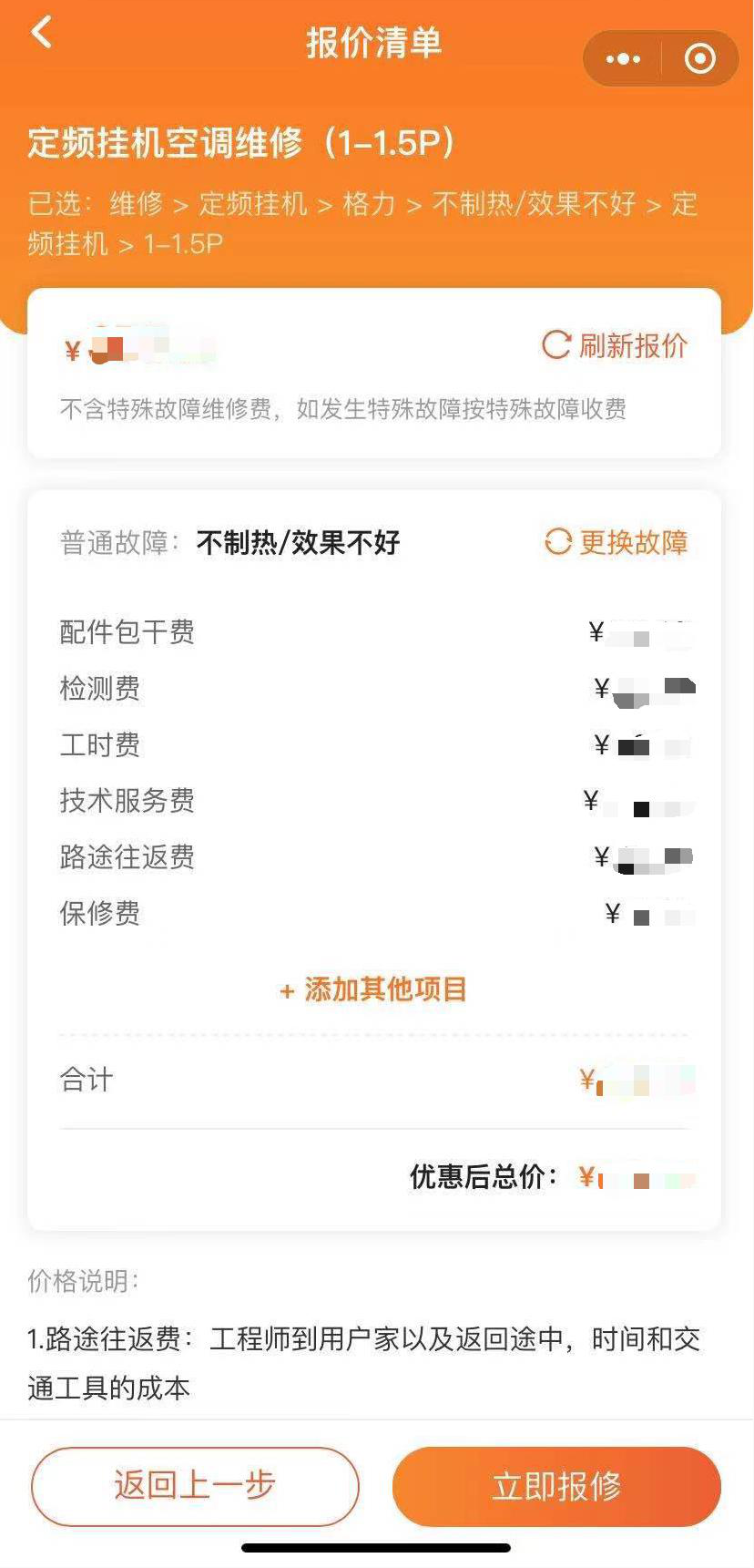 然后根据选择电器品牌、故障表现等选项进行智能计价,