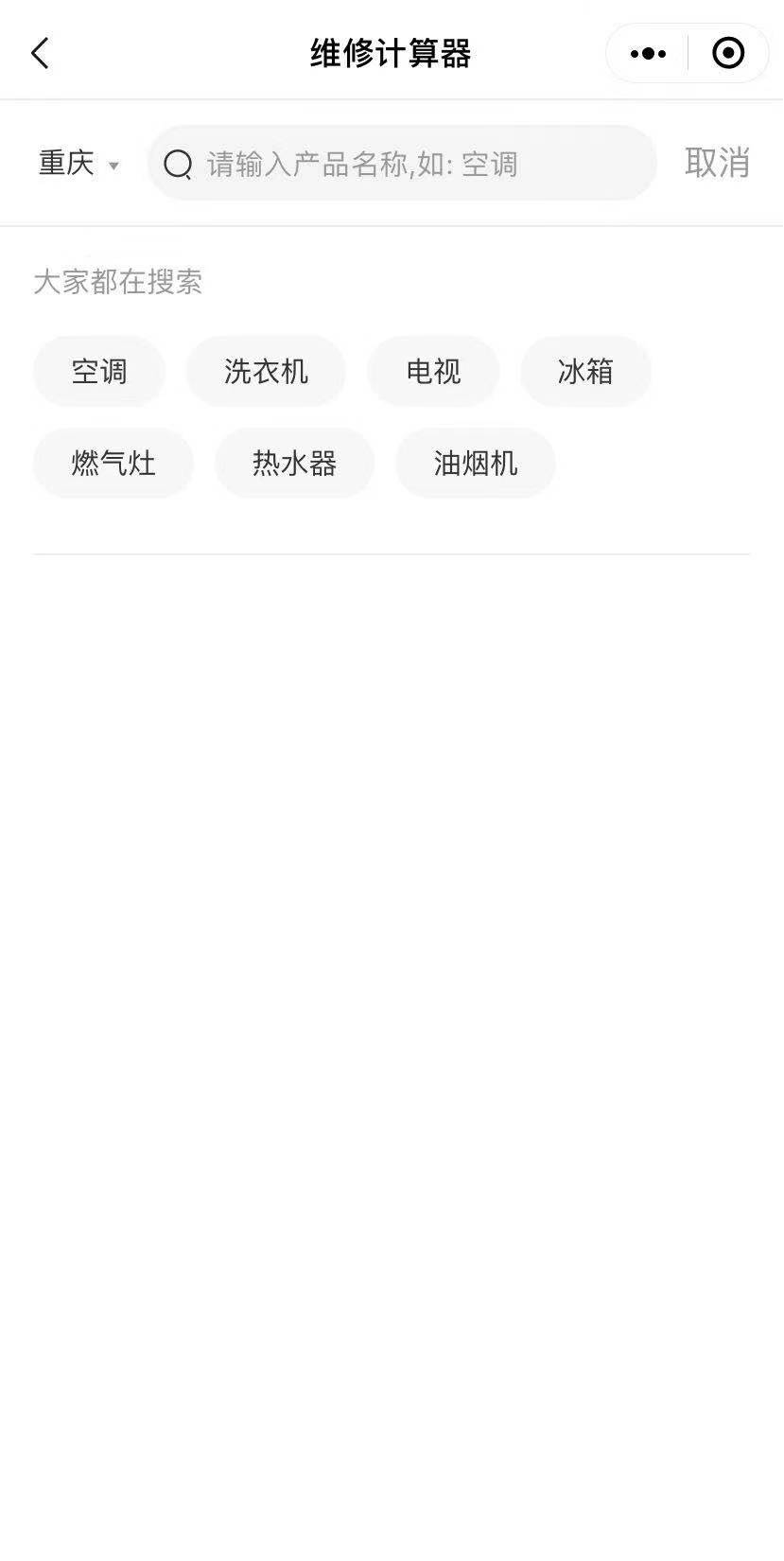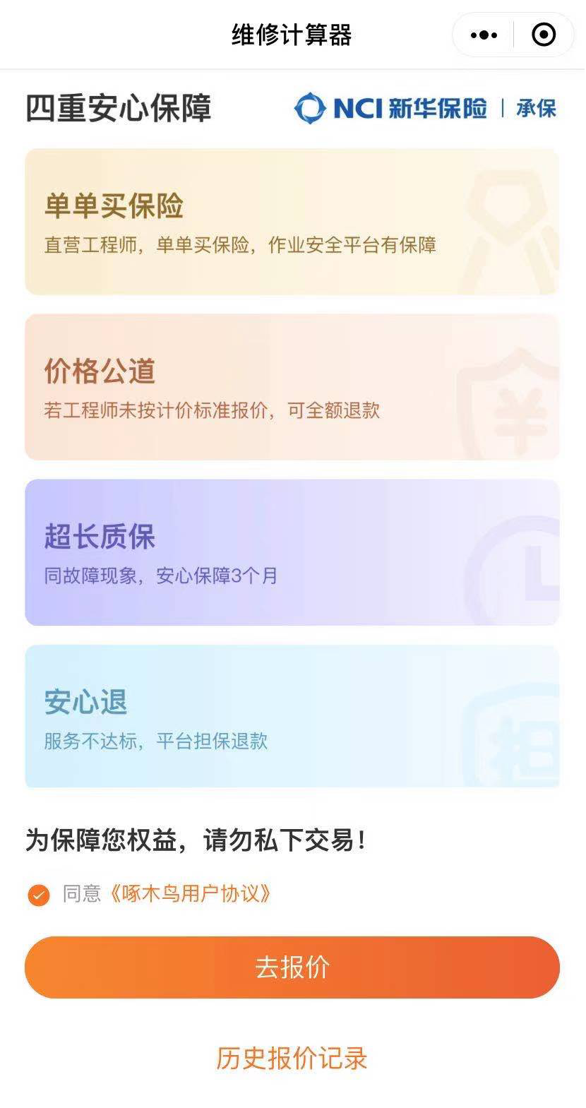 2020年12月21日,啄木鸟维修计价器上线,我们在微信小程序输入“维修计价器”,就会进入计价器的首页。