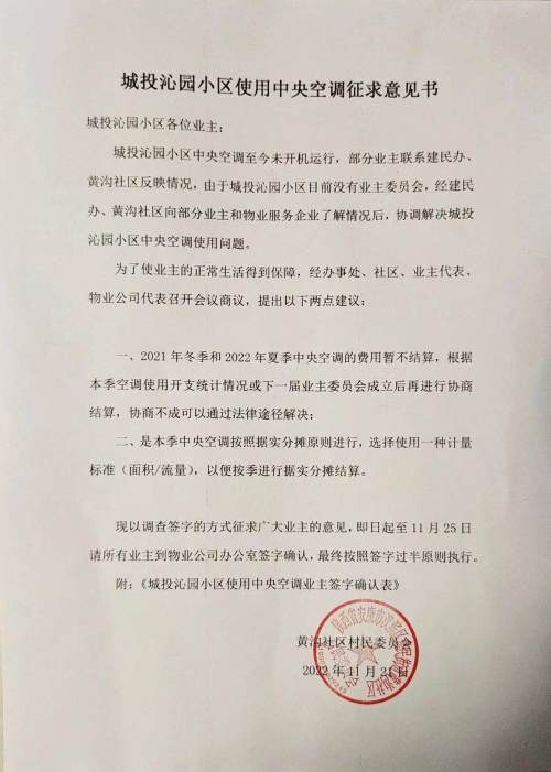 在与业主了解情况的过程中,业主拿出了一些表格,表格是小区物业提供的2021年冬季空调流量使用明细表,上面详细记录了每一户空调使用情况,每一户应退空调费用也是清清楚楚。同时,还有一份2022年11月21日黄沟社区村民居委会出具的城投沁园小区使用中央空调征求意见书。