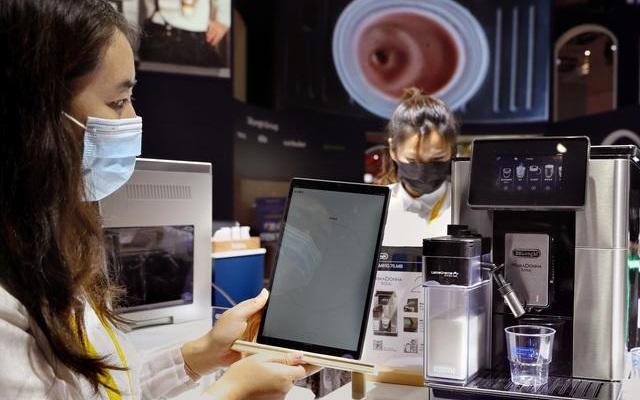 资料图:第四届进博会上,展台人员展示可以连接App操作、可根据所选用咖啡豆特性自动进行适配操作的智能咖啡机。 图/新华社