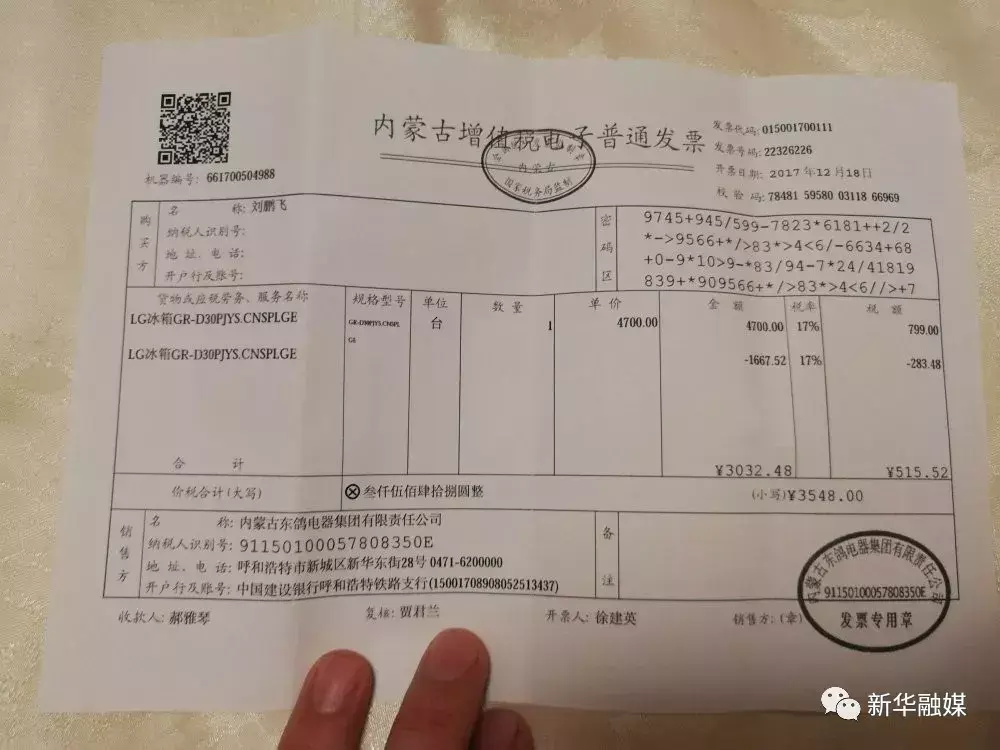 8月9日,刘先生向记者出示的购买发票上面写着:价格:3548元,货物名称:LG冰箱GR-D30PJYS.CNSPLGE,规格型号GR-D30PJYS.CNSPLGE。