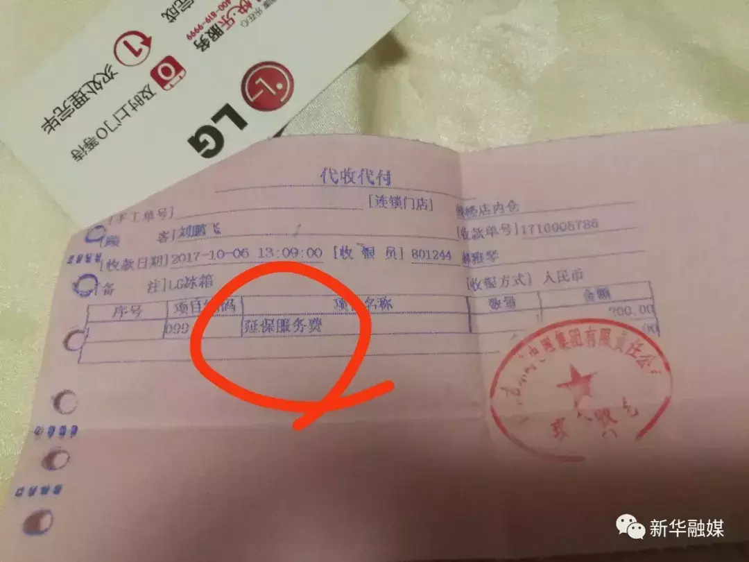 同时,刘先生向记者出具了一张“代收代付”单据,上面显示交款时间为2017年10月6日,在项目名称一栏中写有:延保服务费,金额200元。“但是这200元的‘延保服务费’并没有开发票。刘先生说,冰箱本来保修时间为一年,可是东鸽电器城又给延保了一年,这么算起来冰箱就是有两年的保修期。”