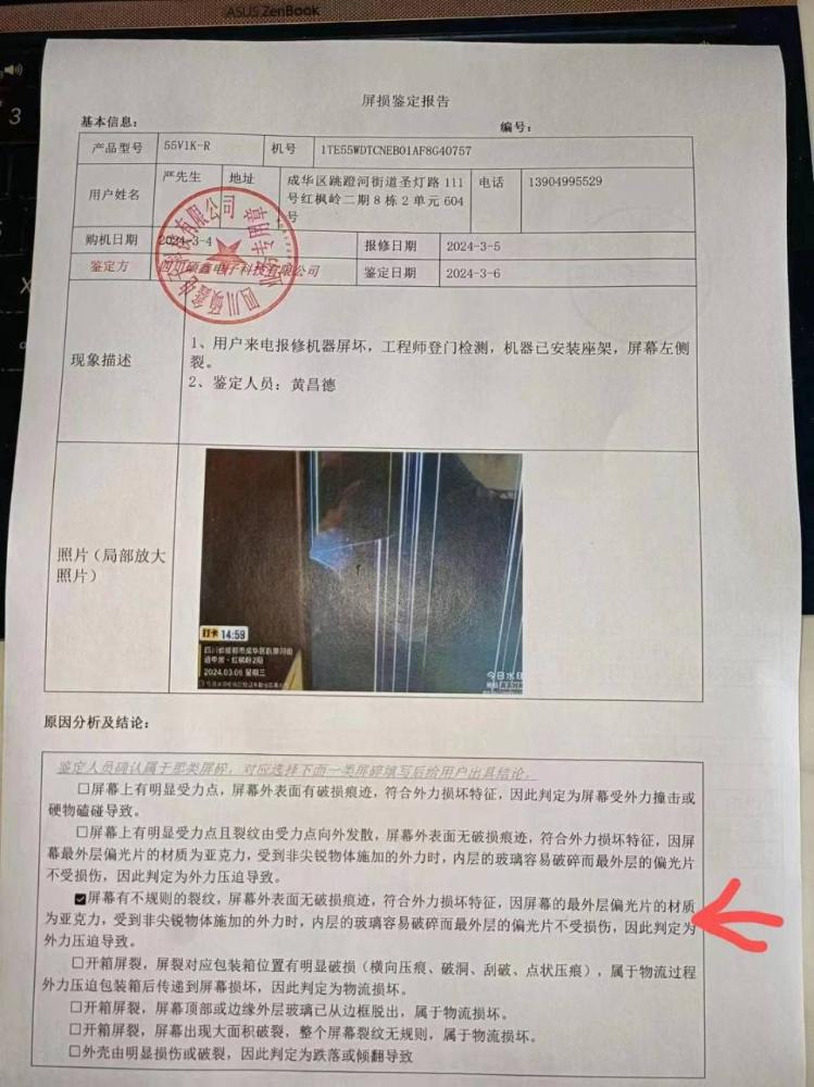在王先生的一再申诉下,次日海信售后找到了一名来自四川硕鑫电子科技有限公司的工作人员上门检测,并出示了一份《屏损鉴定报告》,结论显示:“屏幕有不规则的裂纹,屏幕外表面无破损痕迹,符合外力损坏特征,因屏幕的最外层偏光片的材质为亚克力,受到非尖锐物体施加的外力时,内层的玻璃容易破碎而最外层的偏光片不受损伤,因此判定为外力压迫导致。”