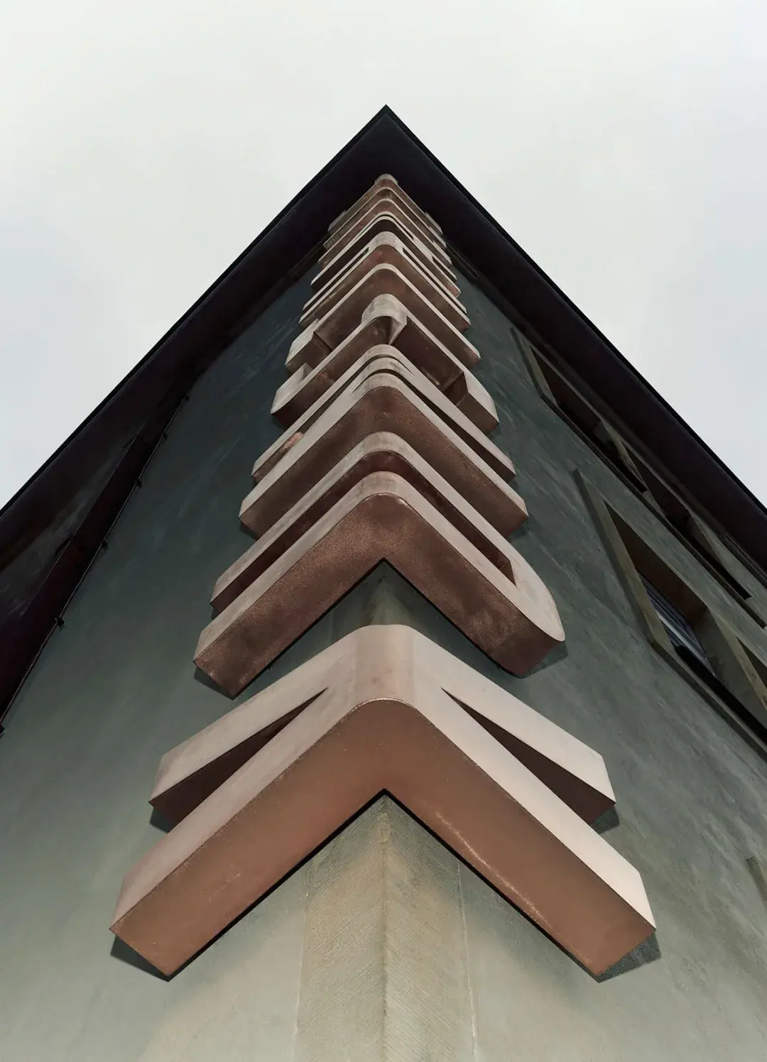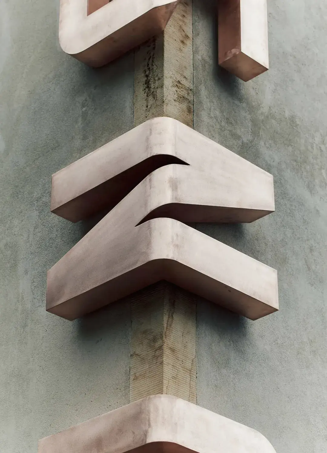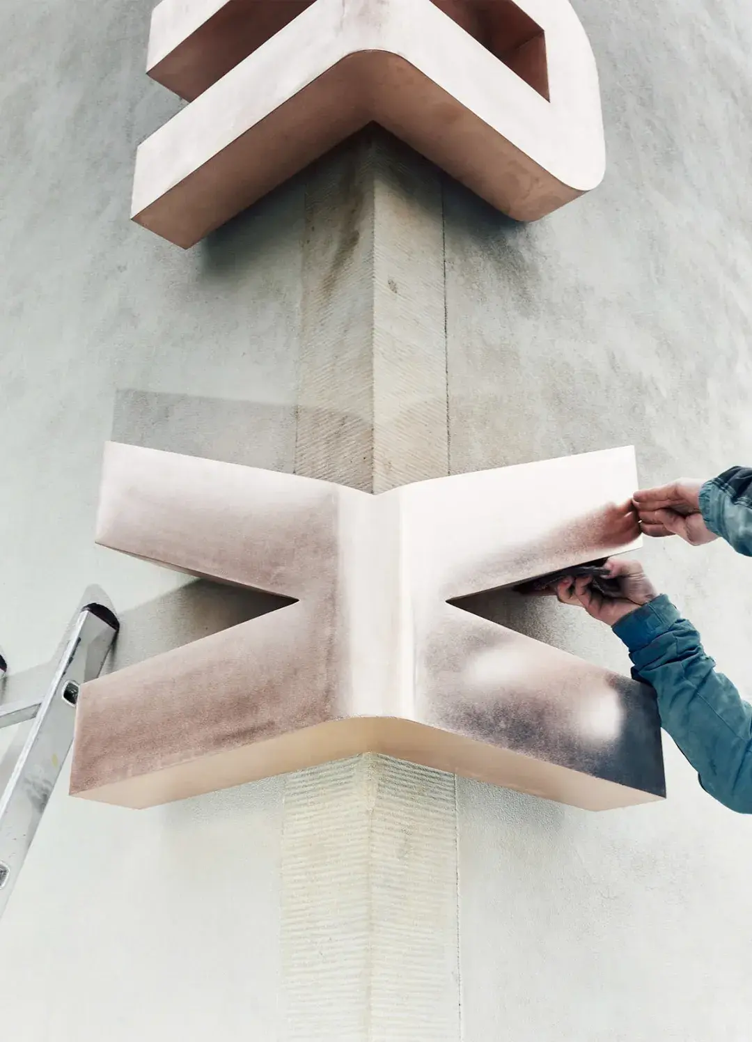 如此的安排不仅能从不同角度都清楚见到标识,也能成为建筑物特定形态的自然组成部分。于是,字体在立面上的应用经历了多次修改和测试,又对Kunst 字体中心笔画予以必要的加强,工作室认为「由此产生的金属铭文绝对是我们在公共空间中对排版的最大实现!」。