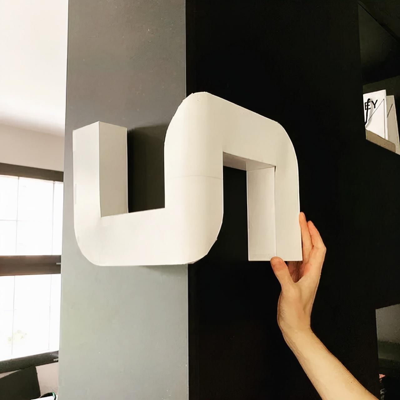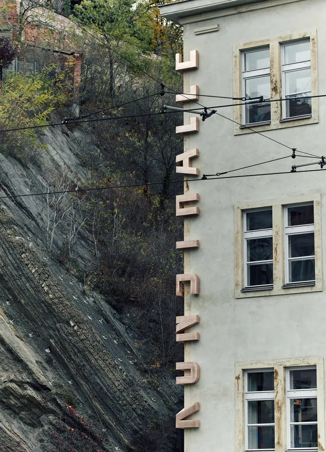 Studio Najbrt 工作室为「布拉格艺术馆」打造转角墙面的字体招牌。大家可从不同角度都清楚见到标识。