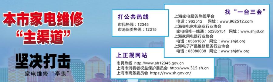 同时,市商务委、962512上海家电服务平台及相关行业协会会通过官网、官方公众号等渠道,公布新一批的行业推荐维修机构信息,以及相关家电品牌的官方服务热线。962512上海家电服务平台的962512服务热线、上海交家电行业协会的52285151家电报修一线通也提供电话报修咨询服务。