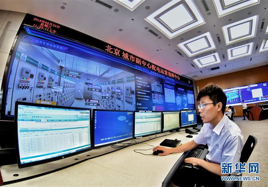 工作人员在北京城市副中心新建成的“一体双核”电网智能管理系统控制室工作(2018年5月23日摄)。 新华社记者 李欣 摄