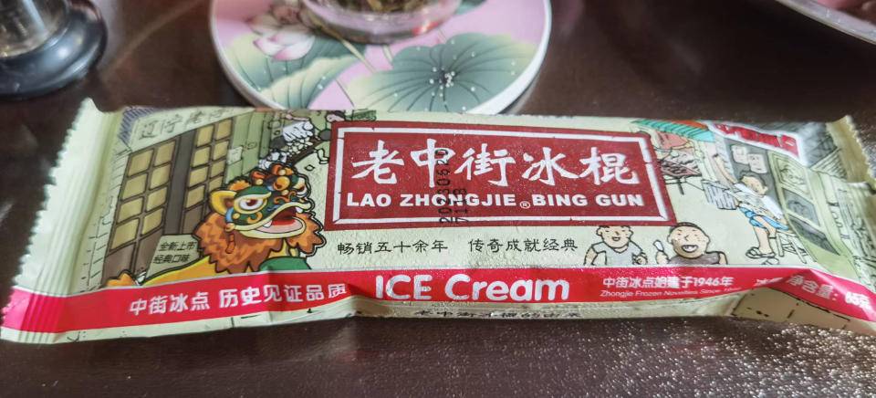 大哥骑着大金鹿牌二八自行车卖冰棍,为了加强承载,在车子载货的后座加了两根铁质竖梁,后座上绑着一个用红漆写的“冰棍”字样的灰白色箱子,这特制的冰棍箱是冰棍厂为拓展销售而无偿借给的,箱内码放着一排排冰棍。