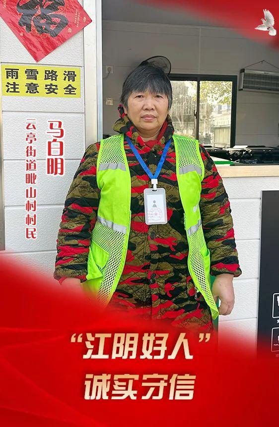 马白明,女,1967年生,云亭街道毗山村村民,垃圾分类屋督导员。2024年2月24日上午,马白明正和往常一样,在小区生活垃圾分类亭对生活垃圾进行二次分拣工作,一条金黄色的链子突然从垃圾袋中掉出。马白明发现手链颇有些分量,不像被随手丢弃的物品,她立即报告给了主管部门,经过确认,这是一条“货真价实”的黄金手链。为尽快归还财物,马白明发动物业、网格员寻找失主,一个小时后,一位年轻女业主匆忙赶到生活垃圾集中分类点,经确认,马白明捡到的手链正是女业主大意遗漏的,价值将近1万元。失主也特地制作锦旗表示感谢,马白明用诚实守信的善举为社会传递着正能量。