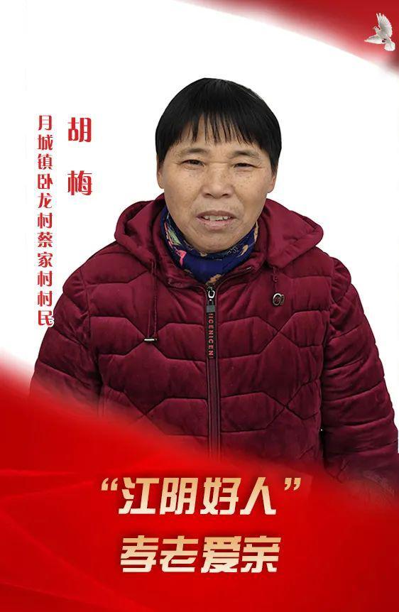 胡梅,女,1965年生,月城镇卧龙村蔡家村村民。胡梅的小叔子阙德华有先天性智力缺陷,缺乏生活自理能力,公婆在年迈时,就把阙德华托付于嫂子胡梅照顾。2005年,胡梅的婆婆去世后,照顾阙德华的重担就彻底落在了她的肩头,她日复一日地悉心照顾着小叔子的生活起居,每天为他洗衣做饭,嘘寒问暖。有村里人建议胡梅把阙德华送到敬老院,但胡梅仍坚持亲自照顾小叔子,与他一起生活,还像教育自己的小孩一样教他各类生活技巧。一个饭桌吃、一个屋檐下住,胡梅20年如一日地用真情阐释了孝老爱亲的人间大爱。