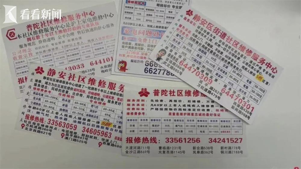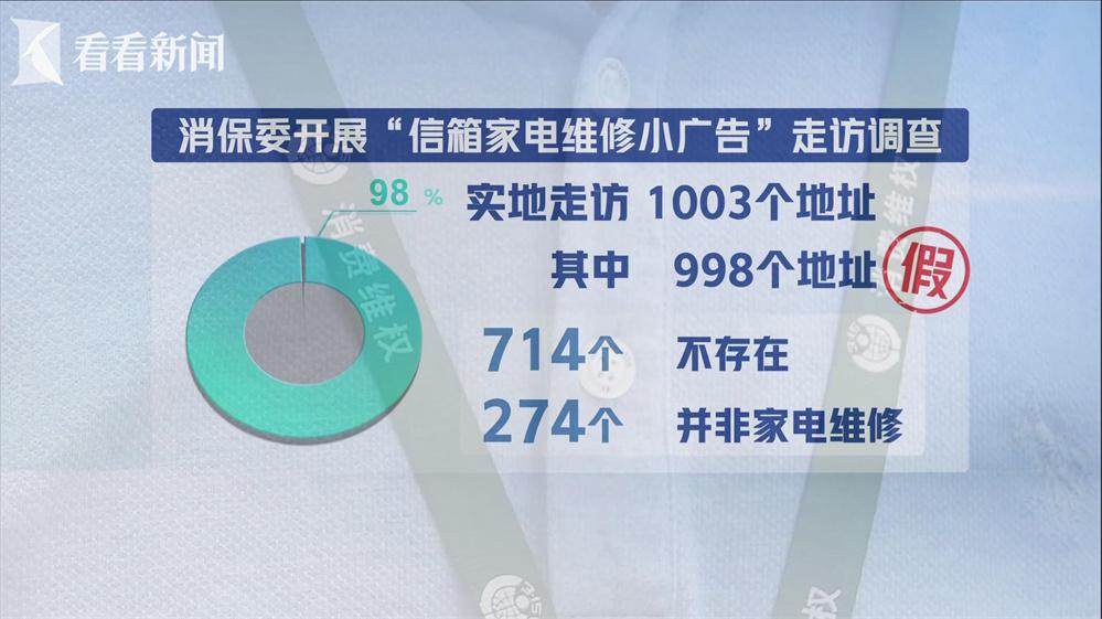 市消保委统计显示,实地走访的1003个地址中,714个地址的门牌号根本不存在,还有274个地址并非家电维修店铺,剩下的15个地址则是私人的普通维修小店,也就是说,没有一家是所谓的“社区指定维修服务中心”。其中有几个报修号码,还反复出现在了多个区的广告上,名头一变再变,有几十个所谓的经营地址,全部查无此地。简单来说,信箱小广告的可信度为0。