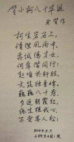 贺敬之住院躺在病床上的时候,柯岩同志来看望、照顾贺敬之。贺敬之说这传染呐,这是隔离的病房。柯岩就是不以为然的样子,她说那有什么!这让贺敬之很感动。