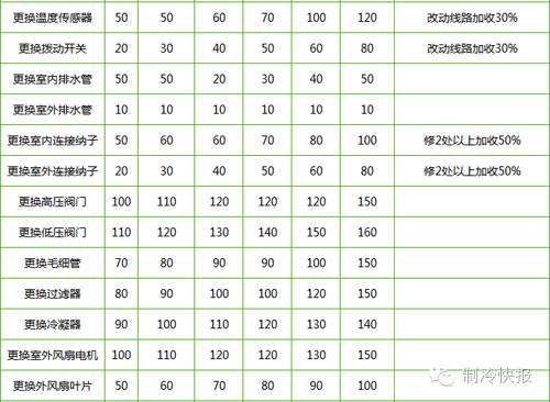 备 注: 家电维修网公布的《空调维修收费标准》是根据国家发展和改革委员会颁发的《家用电器维修服务明码标价规定》而制定的,《空调维修收费标准》内所述费用可供用户参考,但仅为维修费及换件工时费,不包含零件费(10元以下配件免费)。主要配件局部损坏但不希望更换整件或原厂家以不提供配件销售,在此情况下若客户强烈要求对配件及整机进行修复,将收取在更换此配件维修费的基础上加收50%的费用,经维修师上门实际检查之后,根据行业协会及公司规定,以先议后修为原则(表中未列项目亦属于议价范围)。
