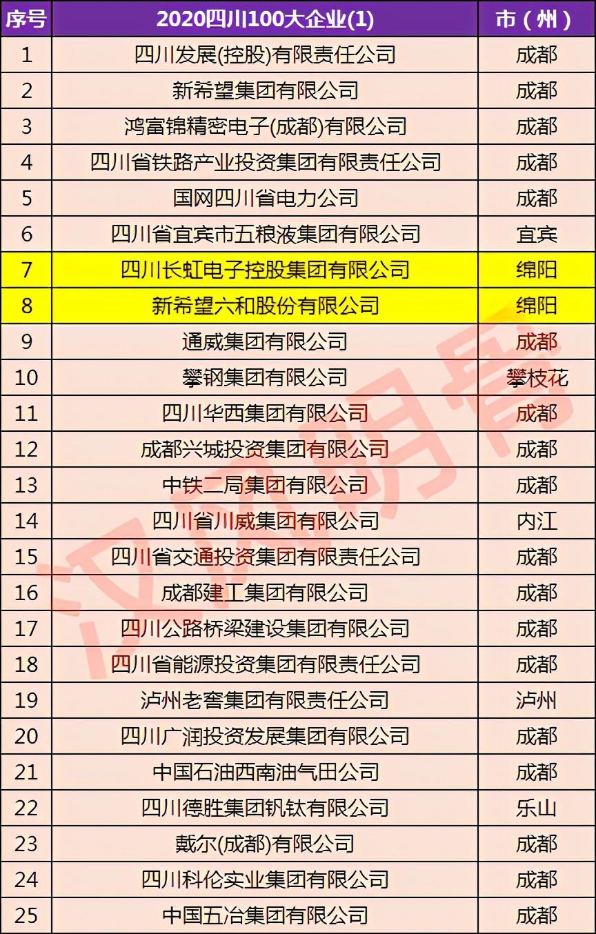 2020年底四川省经信厅发布的“2020年四川省100户大企业大集团名单”中,绵阳有9家企业上榜,上榜企业数量仅次于成都(68家),多于攀枝花(5家)、宜宾(4家)、德阳(4家)等城市 ,在具体排名方面,四川十强企业中,绵阳更是贡献2家,顶级企业的实力极为雄厚。