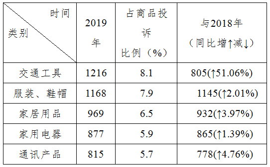 位于前5位的分别是:交通工具、服装鞋帽、家居用品、家用电器、通讯产品