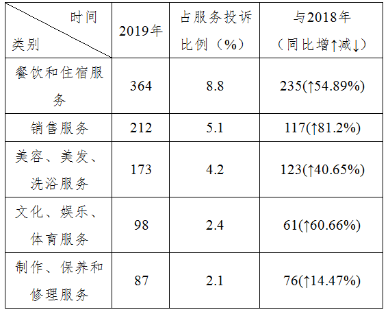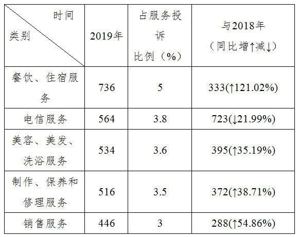 (2)服务类消费投诉5466起,占整个消费投诉的37%,位于前5位的服务分别是:餐饮、住宿服务;电信服务;美容、美发、洗浴服务;制作、保养和修理服务;销售服务