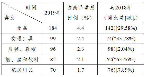 1 商品类举报2076起,占全部举报的50.14%,位于前5位的分别是:食品,交通工具,服装鞋帽,烟、酒和饮料,家居用品