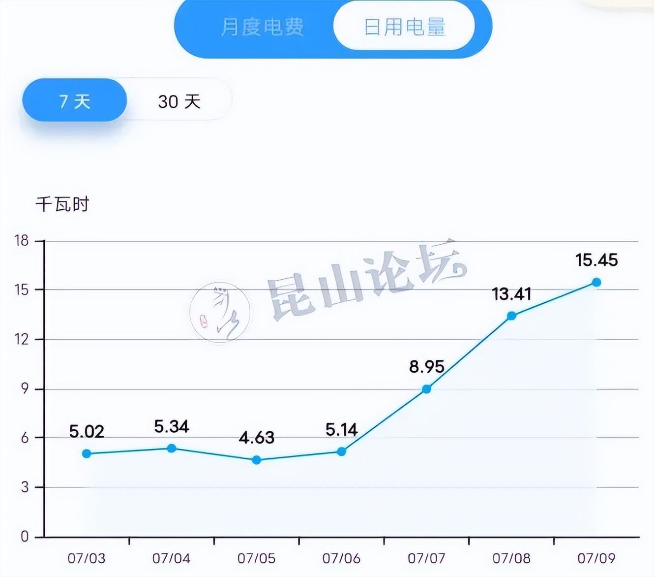 近日,昆山论坛网友“侯小希”发帖爆料: 家里的电费蹭蹭蹭上涨,开一天一夜的空调就15度电了,比平时多用10度电,这个夏天有点热。