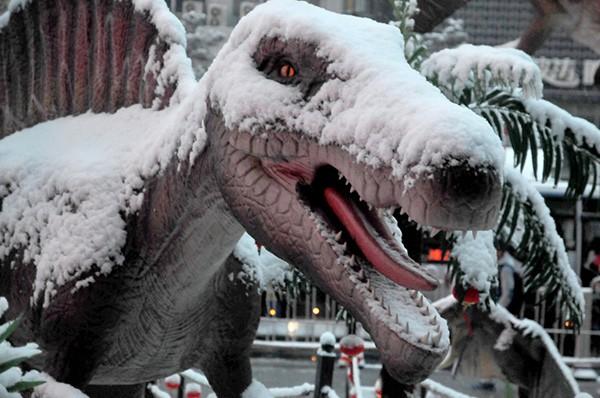 △ 1月22日,西安普降大雪,某购物广场门前的景观“恐龙”披上了雪装。