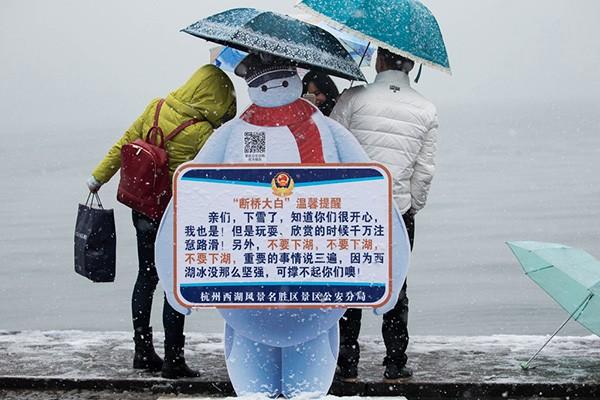 △ 1月22日,杭州大雪纷飞,游客蜂拥而至西湖边看雪,警方发布安全提醒。