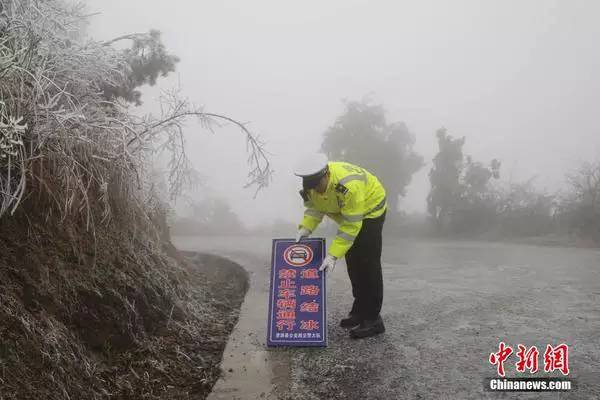 △ 1月22日,广西桂北资源县高寒山区部分公路路面结冰情况进一步加剧,公路一度中断通行。图为交警摆放交通提示牌。