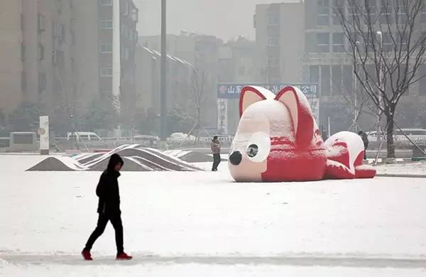 △ 1月22日,山东泰安市区,广场上的阿狸身上落满了雪花。