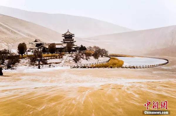 △ 1月21日,敦煌鸣沙山月牙泉呈现出雪舞黄沙、沙雪交融的大漠美景。