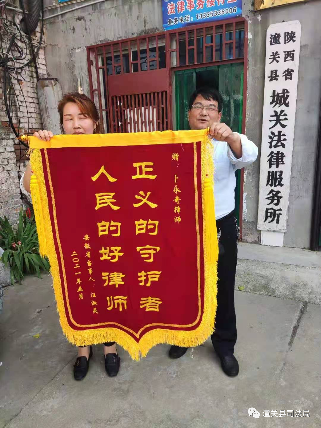 2021年5月11日,安徽省宿州市泗县草沟镇刘铺村妇女汪某来到潼关县城关法律服务所送来了锦旗,对法律工作者办理援助案件的工作态度和效率表示感谢!