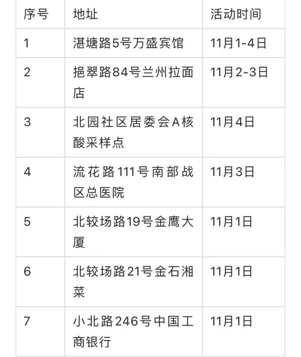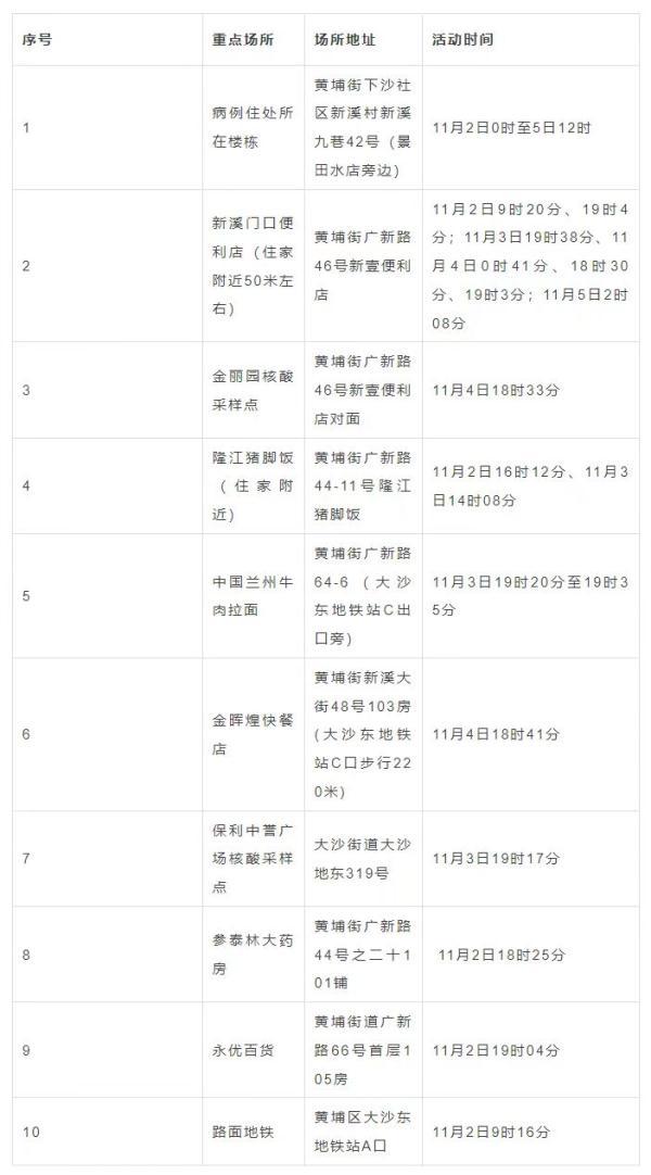 因疫情防控需要,请在以下附表中提及的风险时间前后1小时到过相关重点场所的人员,立即向黄埔街道办(值班电话020-82271053)或当前所在社区(村)联系报备,主动到就近核酸点采样检测,同时配合社区(村)和疾控部门要求做好健康管理。