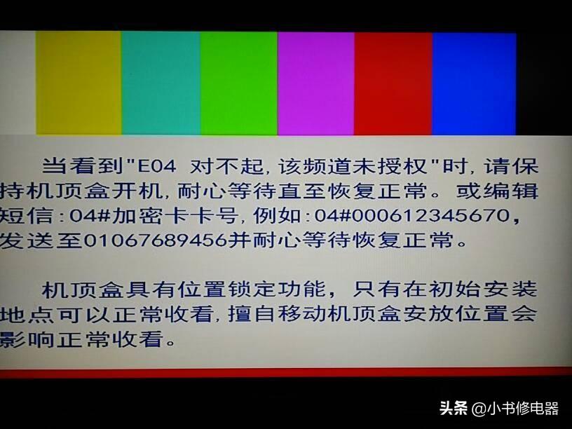 这个问题我要好好说一下了,户户通的加密信息是每两个月更新一次,所以当我们机顶盒超过两个月没开机观看就会出现E04授权丢失,一般出现这个问题的人群大多数为在外务工人群,长期不在家,只有过年才回家。解决方法也很简单,有几种方法都可以解决它,第一个方法我们不用管它,机顶盒在有信号的情况下等待两小时以上,一般可以自行恢复出图像,第二就是打999频道的的人工客服电话,电话为4000166666,选人工客服说明你的问题,客服会帮你下发重新授权指令,一般两分钟恢复收看。第三个方法是自己自主授权,就是关注微信公众号:国家广电总局卫星直播中心,关注后进入公众号右下角有菜单栏,点击下菜单会展开,选择重发授权就可以了。后面按照提示输入智能卡号就行了。