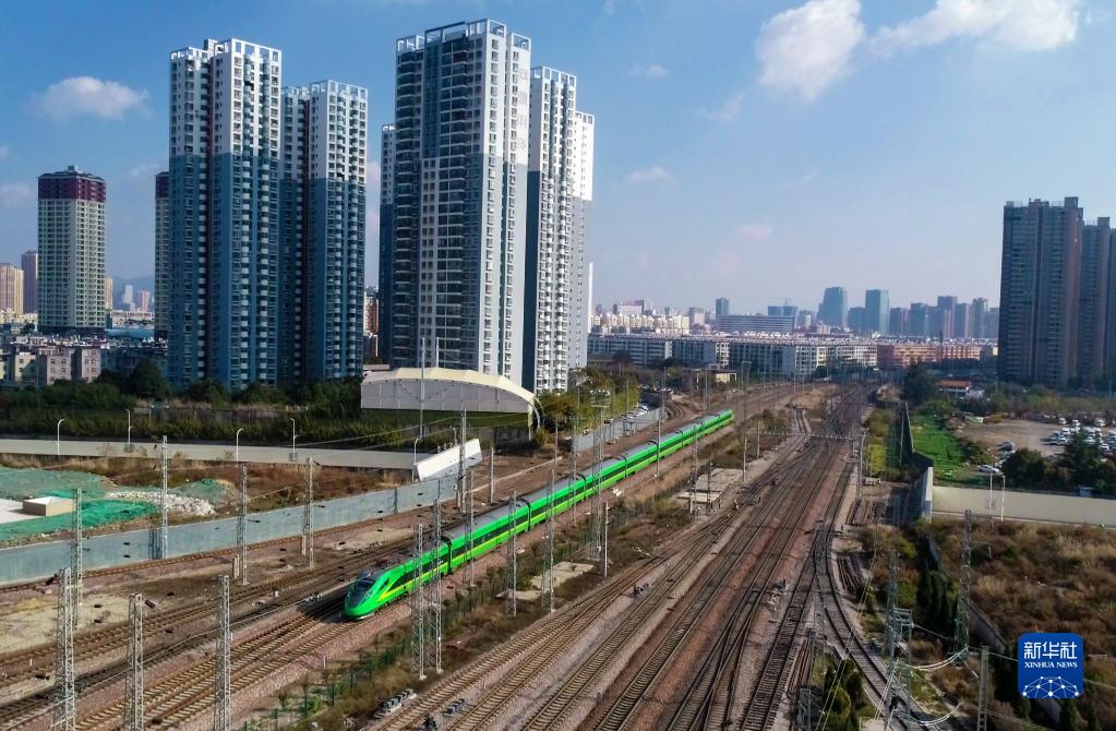 12月26日,昆明经新成昆铁路开往成都南的D858次列车驶出昆明市区。新华社发(杨森 摄)