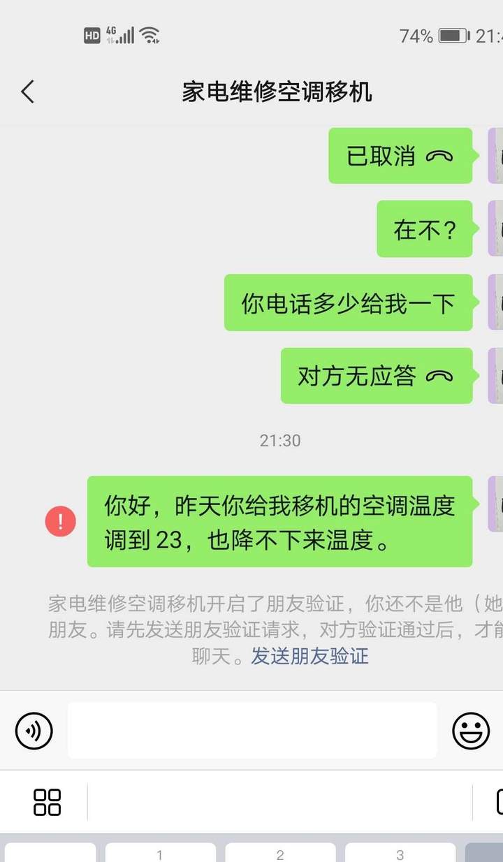 第二天晚上,因为有家具送过来需要安装,我们去了新房子那里,安装的时间比较久,空调自然就打开了,结果开到23度,一个小时下去,室内一点儿也不凉,我非常生气,就微信联系那个移机人,让我大吃一惊,显示我已经不是他的好友,打过电话竟然不接,再打给另一个移机人,电话倒是接了,很显然对我的来电早有准备,说不制冷是没有氟的缘故,我说怎么可能会没氟,新空调用了不到半年,怎么可能就没氟了,人家回复那我就不知道了,完全耍赖了。我问他:“你们的生意都是一锤子买卖吗?”对方还信誓旦旦说那怎么可能,我不知道他们用这种方式欺骗了多少如我和我先生一样信任他们的人。