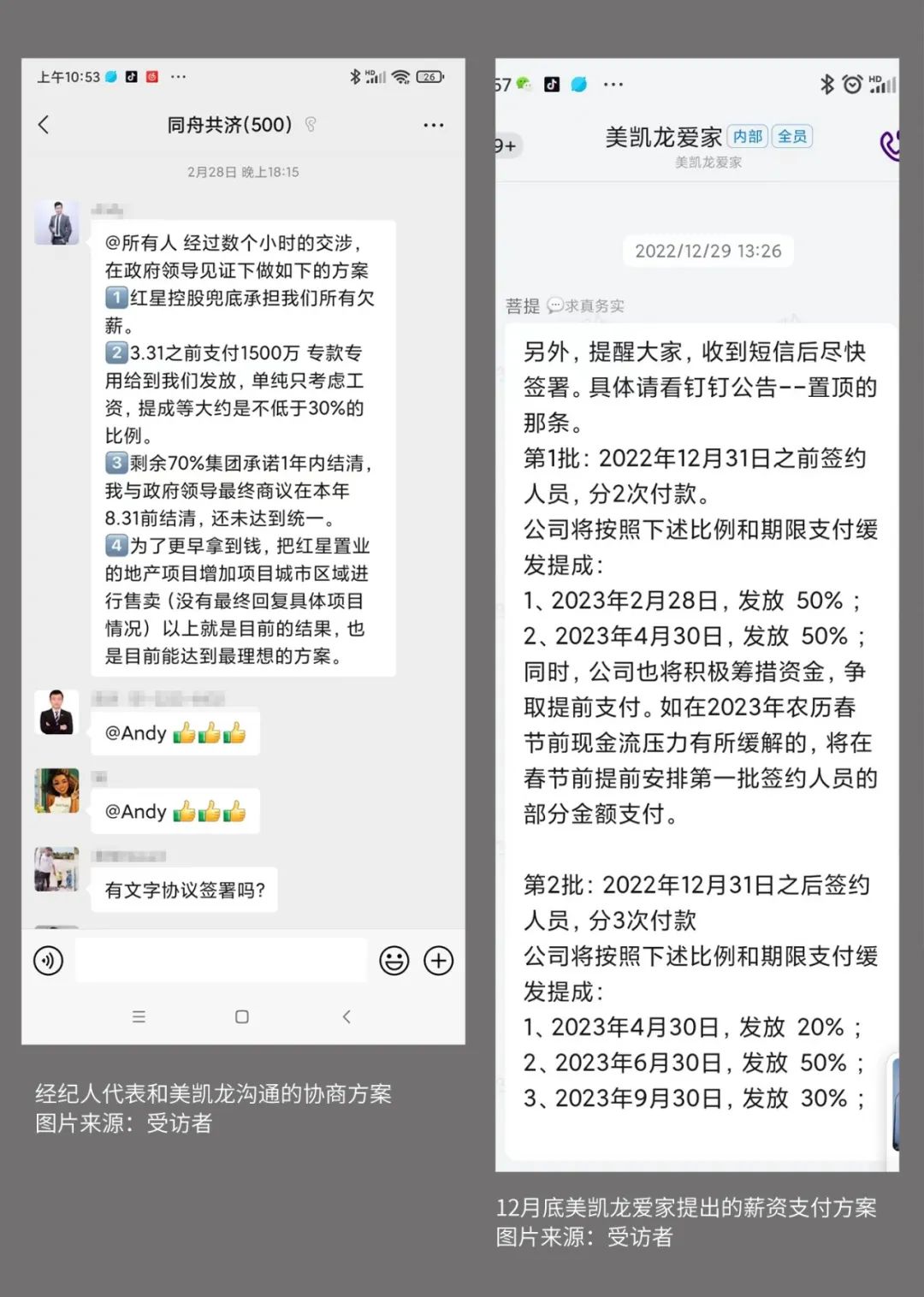 王安迪告诉记者,美凯龙爱家方面表示于2023年3月31日前先支付1500万元用于部分薪资发放,剩余的金额则由大股东红星置业兜底,承诺在一年内进行发放。