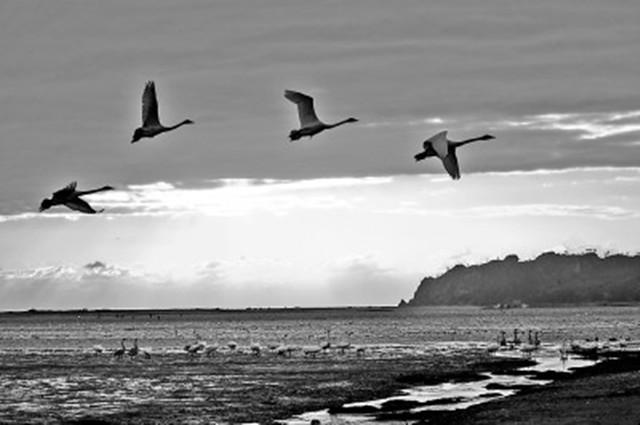 受强冷空气影响,山东出现寒潮天气,带来强降温、大风和雨雪天气。在山东荣成越冬的大天鹅种群纷纷回迁,目前已有1200余只大天鹅回迁至荣成大天鹅国家级自然保护区越冬。图为11月9日清晨,4只大天鹅映着朝霞飞翔。王福东摄( 光明日报11月11日10版)
