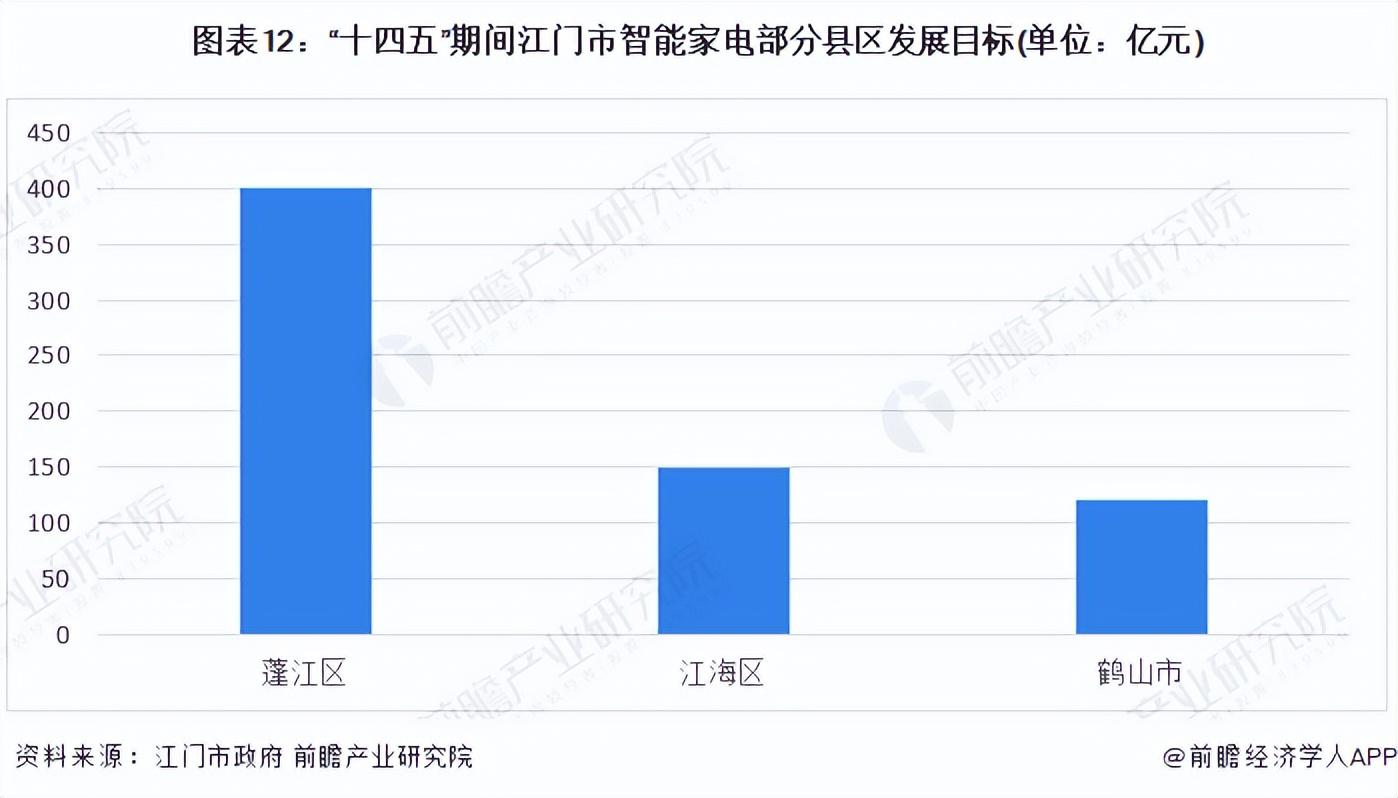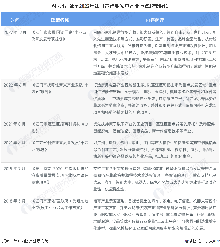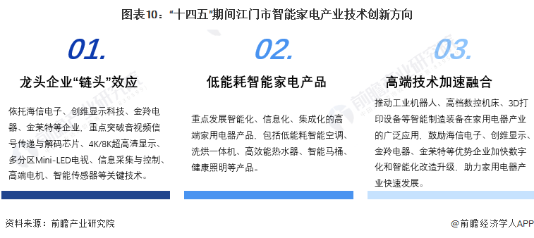 智能家电被列为江门市先进制造业之一。《江门市先进制造业发展“十四五”规划》中提出,推动智能家电产业集约化高端化发展,以黑色家电、白色家电、小家电、灯饰照明、关键材料及核心零部件等领域为重点,着力打造家电全产业链,建设全国一流的智能家电制造城市。