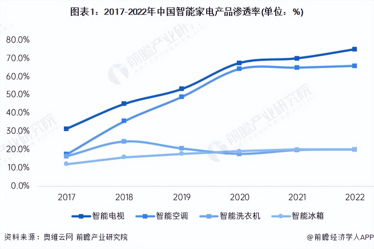 2017-2022年,我国各类型家电智能化渗透率整体呈上升趋势。根据AVC数据,2020年,彩电以及空调智能化渗透率均已超过63%,2021年彩电、空调智能化渗透率在70%左右。初步核算,2022年彩电渗透率进一步上升,空调、洗衣机、冰箱的智能渗透率保持平稳。未来,在消费升级的大背景下,家电类的智能化渗透率将进一步提高。