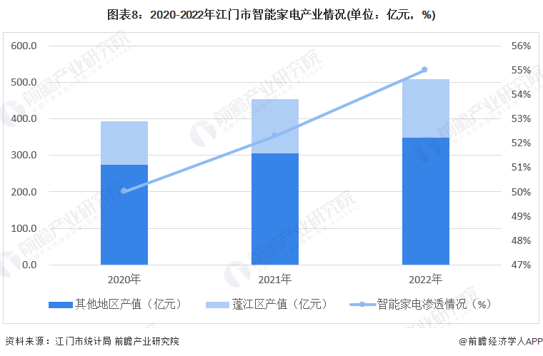 江门智能家电整体朝规模化、品牌化和集群化发展。根据市统计局数据,2020-2022年全市家电行业不断增长,两年增加值超百亿,其中蓬江区产值占比最高,超过30%。全市智能家电产业渗透率超过50%,并且将会进一步提升。