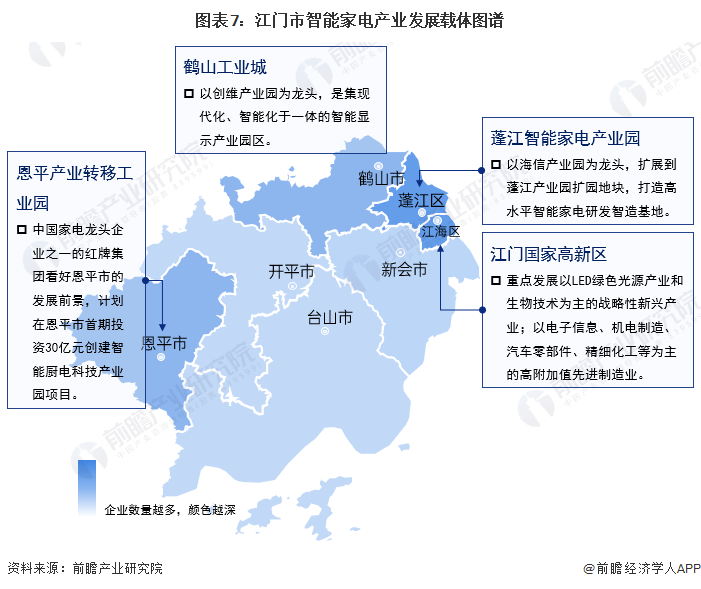 从产业发展载体来看,蓬江智能家电产业园、江门国家高新区、鹤山工业城以及恩平产业转移工业园等聚集区起到了较好的带头示范作用。