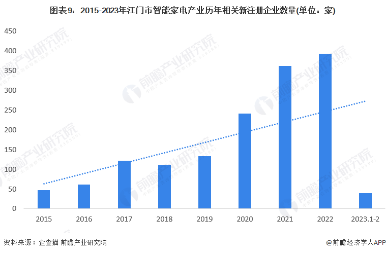 根据企查猫查询数据显示,近年来江门市智能家电历年新注册企业数量从2020年开始激增。截至2023年2月,江门智能家电产业相关的存续在业企业超1700家,其中2022年新注册企业数量达393家;2023年前2月,江门智能家电产业注册企业数量为40家。