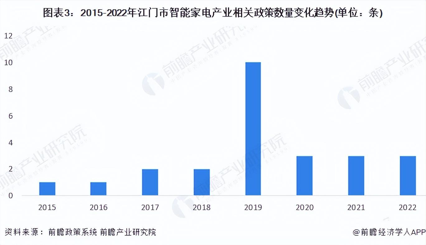 江门市智能家电属于新一代信息技术应用领域。《江门市战略性新兴产业发展“十四五”规划》中对家电产业的规划是,重点引进智能传感器、显示模组、电机、压缩机、模具等核心零部件和配件等优质项目,带动形成完整的产业生态。强化智能家居、智能穿戴、智慧城市等场景应用,推动开发智能化、信息化、集成化高端家用电器产品。联合高校、科研机构和行业协会,建立产学研销一体化区域合作平台。从政策数量来看,2013-2022年政策数量共20条,其中2019年出台的政策数量最多,2019年开始政策支持家电进行智能化改造,将智能家电产业列为五大先进制造业。