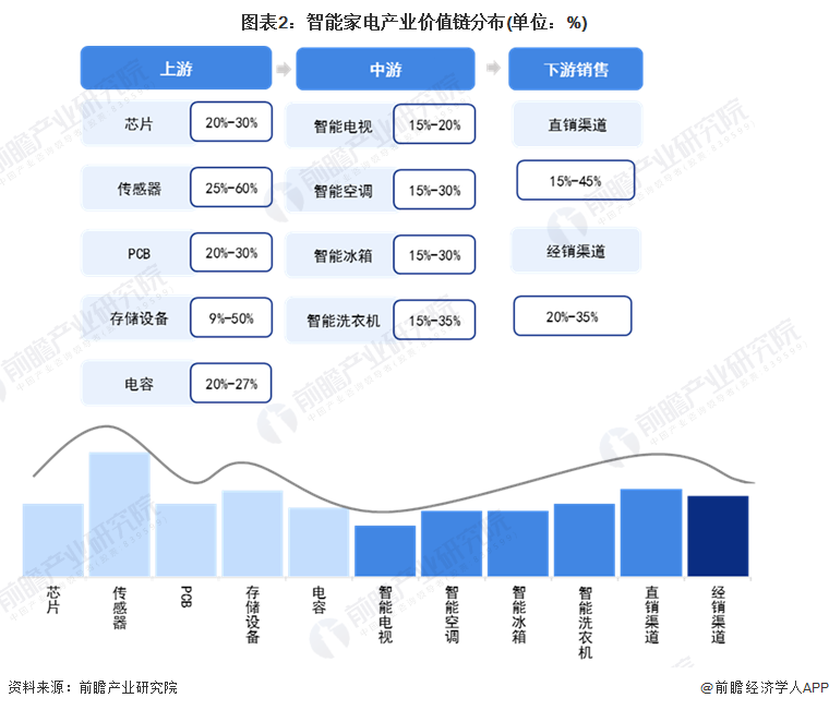 从智能家电行业产业链上下游来看,智能家电行业上游主要涉及技术层,包括元器件工业和中间件供应,其中元器件供应又包括芯片、传感器、PCB和电容等;中间件主要包括通讯模块、智能控制器等;此外,行业上游还涉及基础层,包括AI技术、电信和云服务,而基础层也贯穿上游和中游。智能家电的中游主要是智能家电相关产品,包括智能电视、智能空调、智能热水器、智能吸尘器、智能洗衣机等。而下游消费市场包括线上渠道、线下渠道、经销商、品牌自营店等。目前,智能家电上游传感器、存储设备等环节利润水平相对较高;而中游智能电视、智能空调、智能冰箱等产品利润率差距较小;下游直销渠道利润率略高于经销渠道。