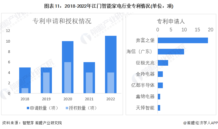 整体来看,江门市在智能家电行业处于加工制造环节,研发程度相对其他珠三角城市较低。目前研发投入集中在智能小家电、智能空调领域,从年份上看,2020年开始研发申请数量增加,2022全年专利11项。